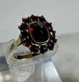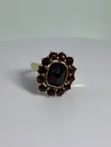 Deze antieke ring is gemaakt van 14 karaat geelgoud. 1 ovale granaat in het midden en omgeven door 12 ronde gefacetteerde granaten. De ringmaat van dit prachtige juweel is 16 3/4 en weegt ongeveer 4,5 gram. Het is volledig gestempeld en gemarkeerd en in goede staat. Zie foto's voor een nadere blik. Dit geliefde juweel heeft een Europese oorsprong.