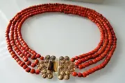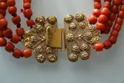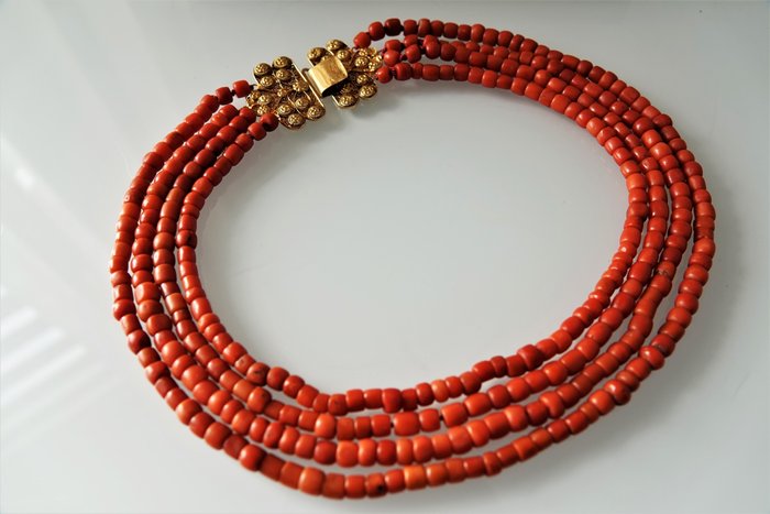 U kijkt naar een antiek Nederlands bloedkoralen ketting met een 14 Karaat gouden kraalhaak, afkomstig uit de provincie Zeeland.