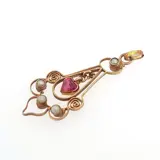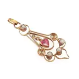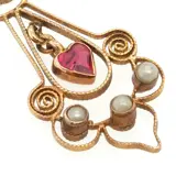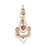 Prachtige antieke Victoriaanse 14 karaat gouden hanger met een hartgeslepen robijn en 4 zaadparels.
