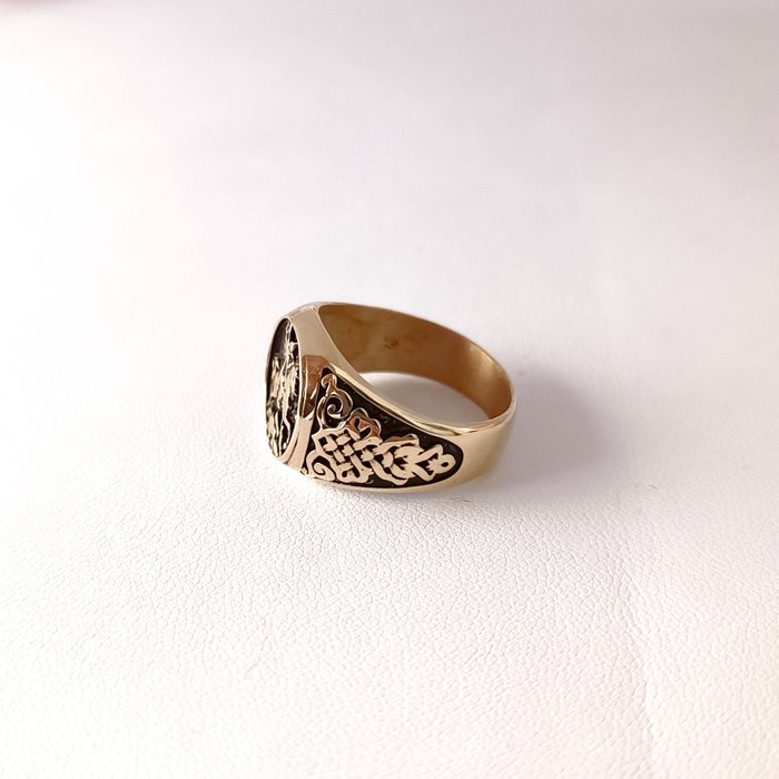 Made in Italy Artisan Jewellery Ring in 14 kt goud die Sint Joris in gevecht met de draak voorstelt.