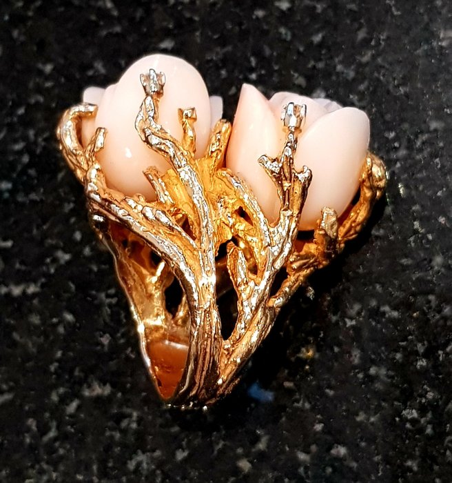 Prachtige ring uit de jaren 50 en 60 in 14k goud = 22.45g, 1 keurmerk, 2 koralen gebeeldhouwd in de vorm van rozen, 4 briljant geslepen diamanten van 2 mm, meet 15 mm..
