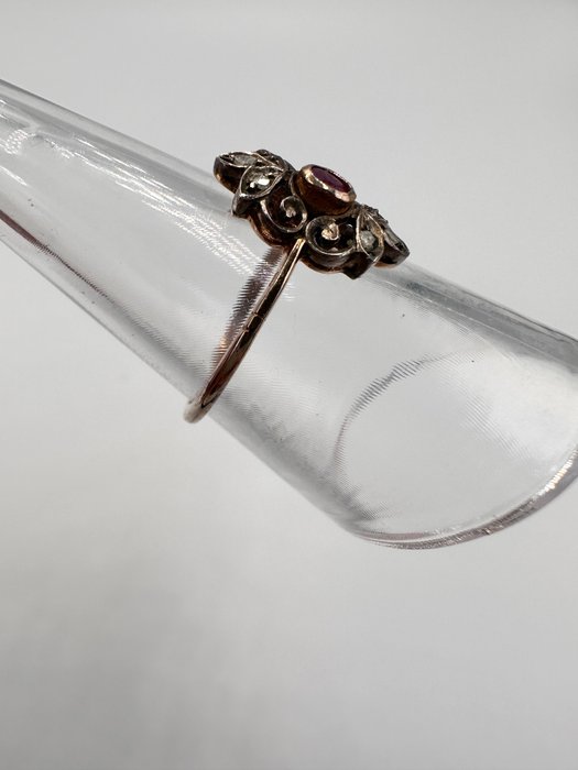 Antieke ring met roosgeslepen diamanten en robijn in 14k goud (gekeurd)