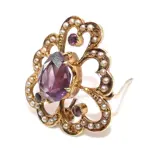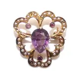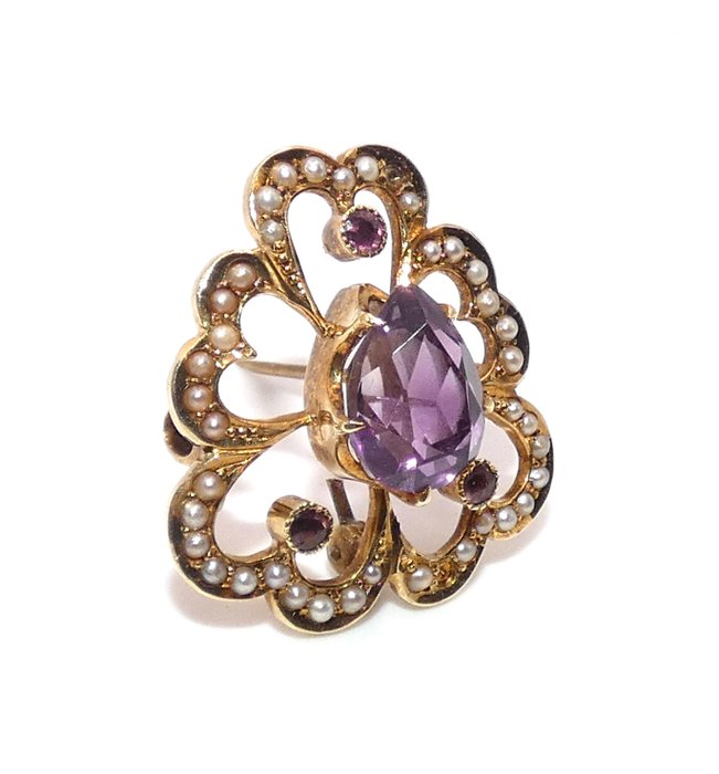 Antiekeart nouveau 14k gouden amethist zaad parel klaver speld broche