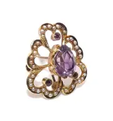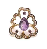Conditie: Leeftijd passende slijtage. Er ontbreken twee zaadparels van de broche, deze kunnen worden vervangen door uw plaatselijke juwelier. De vergrendeling "c" sluiting en pensteel lijkt een vervanging van een vorige eigenaar, die geen invloed heeft op slijtage. Er is een heel kleine chip aan een van de rond geslepen amethisten, maar de steen blijft stevig zitten en dit heeft geen invloed op slijtage. De originele pensteel en scharnier blijven aan de achterkant van de broche; dit kan worden verwijderd door uw plaatselijke juwelier.