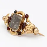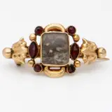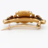 14 Karaat geelgouden rouw broche voorzien van uit haar vervaardigde voorstellingen van bloemen. De broche is verder bezet met gefacetteerde granaten, de granaten zijn gezet in dichte kastzettingen.