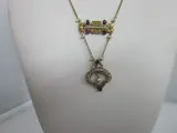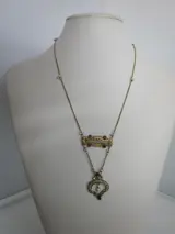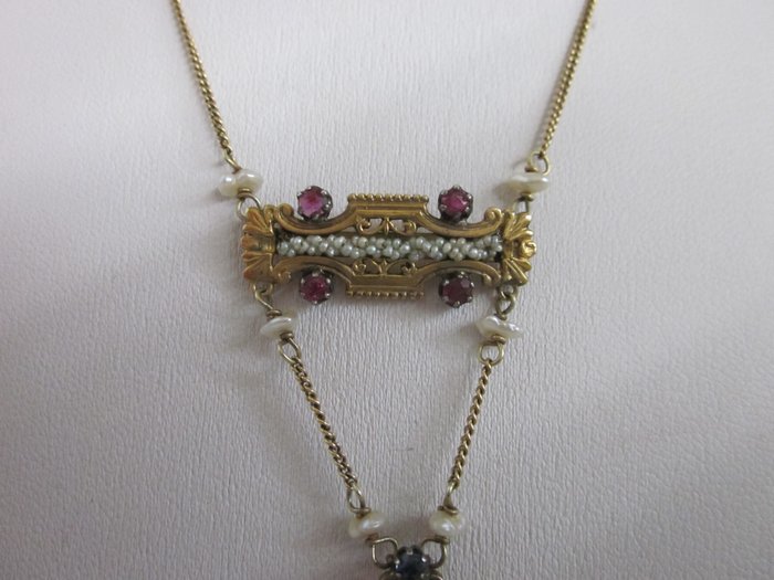14kt gouden collier uit de jaren 30 met microparels in het centrale gedeelte waar 4 robijnen zijn gezet en in de hanger weer microparels en 2 saffieren. Het collier is in uitstekende staat en heeft een totaal gewicht van gr. 6.8. De verzending naar Italië en Europa is voor onze rekening de rest van de wereld 50 euro, altijd met traceerbaarheid. Kopers buiten de EEG dienen rekening te houden met douanerechten.