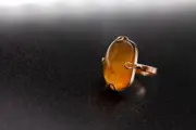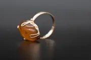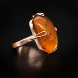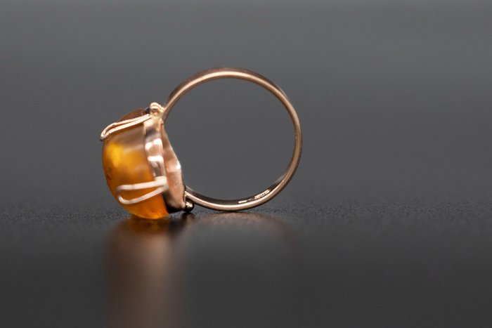 Een 14-karaats gouden ring uit de jaren 1965-1980 in de Sovjettijd van Rusland. Hij draagt een grote amberkleurige steen.