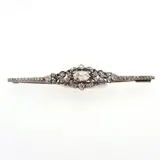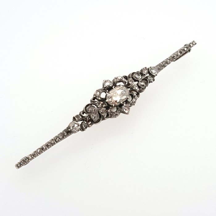 Een prachtige 14 karaat gouden antieke broche zeer rijk gezet met 50 roosgeslepen diamanten gezet in zilver op goud. De hoofdsteen heeft een karaatgewicht van 0.40 ct, het totaal karaatgewicht is 1.00 ct.