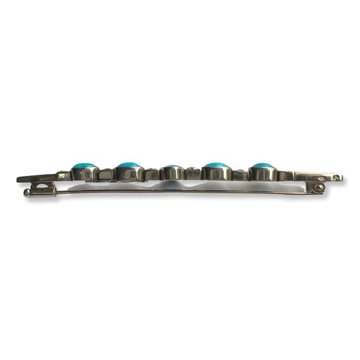Staafbroche gezet met cabochongeslepen turkoois en roosgeslepen diamanten. Gekeurd met een Nederlands eikenblaadje, gebruikt tussen 1905 en 1952. Reparatie aan achterzijde, zie foto's.