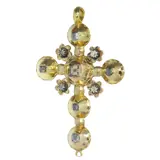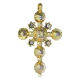 Crafted circa 1680, this pendant exemplifies the grandeur of Baroque artistry, with its vibrant curves and opulent, symmetrical forms. It features six table cut diamonds and four senailles set in 18K yellow gold—a precious metal whose lustrous sheen is augmented by traditional foil setting techniques. This pendant, lacking any trace of hallmarks, is a silent testament to the cross’s enduring symbolism in Christianity and its significance in Baroque iconography. The piece captures the spirit of an era that celebrated the dramatic interplay of divine and worldly splendour.