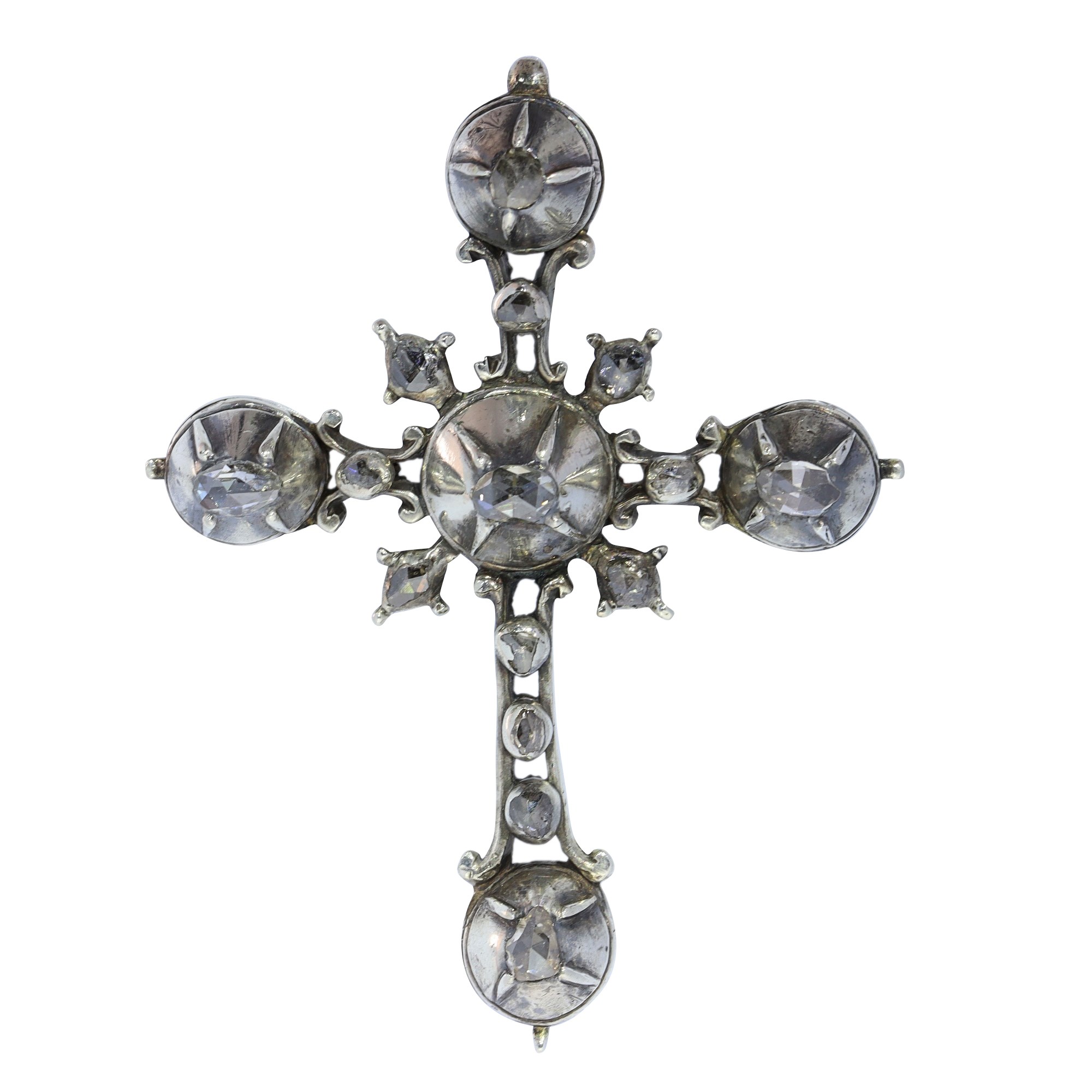 A vintage silver cross pendant from around 1750 showcases the ornate Rococo design. Adorned with fifteen rose cut diamonds and senailles, each diamond is set to emphasise its radiance. Uniquely, the reverse side is treated with fire-gilding, a historic technique intended to prevent tarnishing against skin and fabric, highlighting the piece’s practical and artistic heritage. This pendant is a testament to the sophisticated artistry of the mid-18th century, presenting a piece that resonates with the elegance and charm valued by aficionados of antique jewellery.