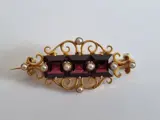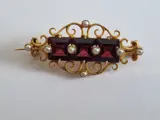 Zeer mooie broche in 18 karaats goud en decoratie in rood glas.