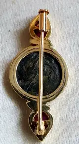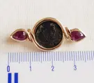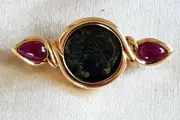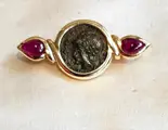 Fantastische broche in 18K geel goud (getest) 2 natuurlijke robijnen en een bronzen munt.
