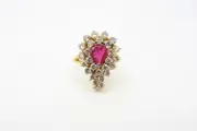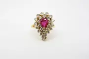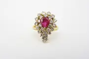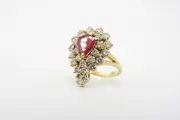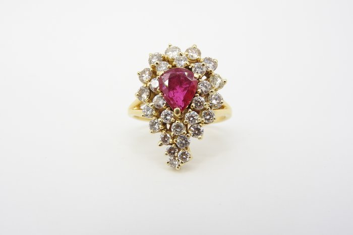 Coktail ring uitgevoerd in 18kt. geelgoud bezet met natuurlijke robijn en diamanten.