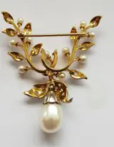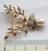 Prachtige oude broche in 18k goud, platina, 18 diamanten en 11 natuurlijke parels. Zeer verfijnd en elegant!!!!