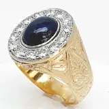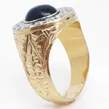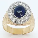 Gouden ring van het zegeltype, versierd met een mogelijke saffier van 9,5 x 7,5 mm en 3,5 ct, omzoomd door 14 oud geslepen diamanten van 2,7 mm en 0,07 ct, totaal gewicht ongeveer 1,0 ct, gezet op platina-vizieren.
