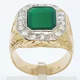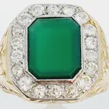 Gouden ring van het zegeltype, versierd met een achthoekige chalcedoon van 3,3 ct, omzoomd door achttien 2,5 mm en 0,06 ct oud geslepen briljanten, totaal gewicht bij benadering 1,10 ct, gezet op platina-aanzichten.