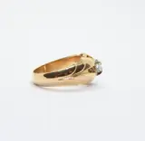 Aangezien de ring geen fabricagekenmerken vertoont, is deze geanalyseerd in toetssteen met reagens, wat een positief resultaat van 18 karaat opleverde.