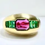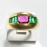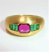 Moderne platte designring in 750/18 kt geelgoud. Een Italiaanse goudsmid werkt met de hand. De ring is uit één stuk gemaakt en loopt wijder uit naar het midden toe. In het midden is een prachtige heldere robijn van 0,40 ct gezet. gegeven ruimte. De robijn is plat smaragd geslepen. De robijn is aan beide zijden naadloos verbonden door drie baguette-geslepen smaragden van in totaal 0,60 ct. Aan. Alle gekleurde edelstenen hebben een uitstekende kleurkwaliteit en het goudsmidswerk is uitmuntend in uitvoering.