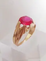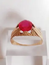 18k geelgouden ring. solitair ontwerp versierd met een 1,0 ct rond geslepen robijn gezet in 6-punts tanden als kroon op een opengewerkte galerij in glad goud met groeven aan de zijkanten en kroon.