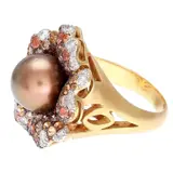 18K goud, kleurloze en bruine briljant geslepen diamanten, ca. 1,35 ct, kleurrijke saffieren, ca. 1,60 ct. Volle 23,84 en 11 mm diameter bruine chotolate tahitiaanse parel. Maat 13/53. 20,2 gr