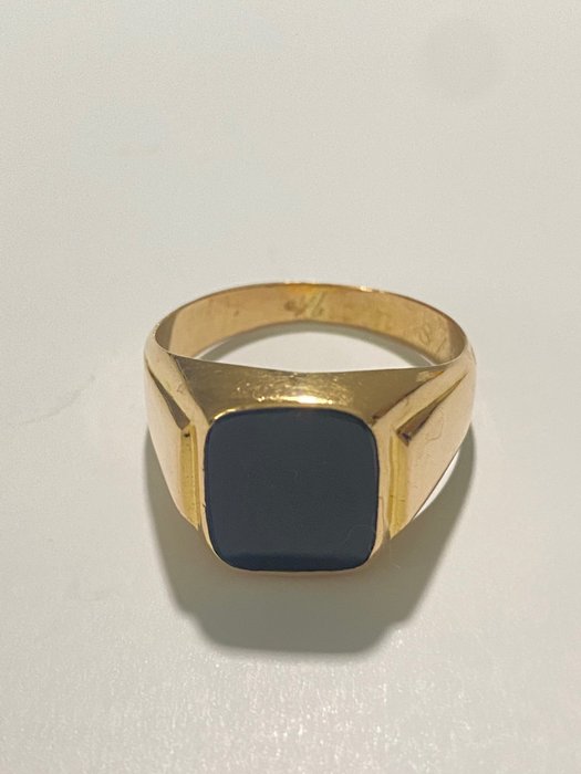 Ring in geelgoud 18 kt. Met onyx, 5,50 ct. Met gravure gedateerd 1964.