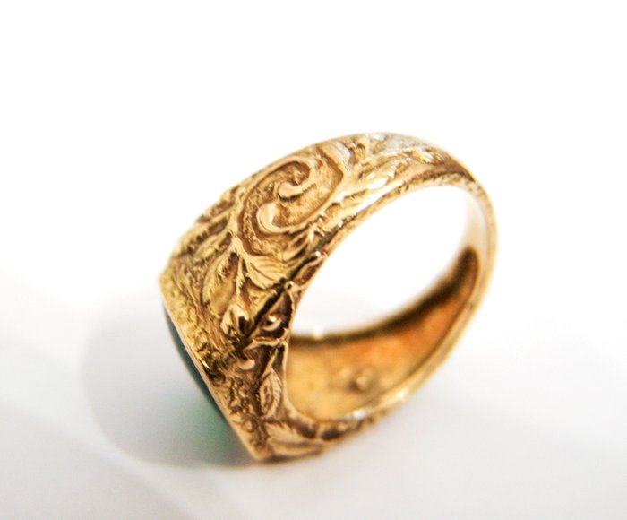 Geelgouden ring gegraveerd met bloemmotief over de gehele oppervlakte (takken en bladeren) met harde groene steen. De omtrek van de ring is ongeveer 8 cm