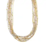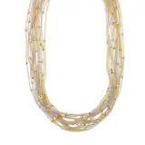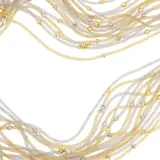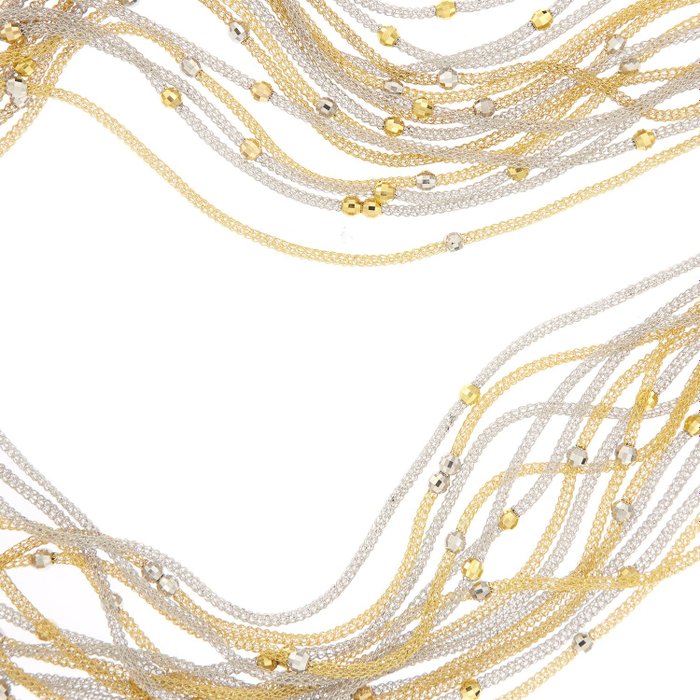 Meerstrengs collier in 18 kt (750/1000) witgoud met 15 strengen: 7 in geelgoud en 8 in witgoud met gefacetteerde kralen in geel- en witgoud, haak met kraal aan weerszijden en hartvormige schakels.