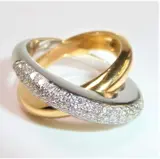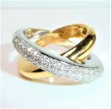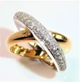 Massief vervaardigde ring in 750/18 kt geelgoud met witgoud. Het ontwerp bestaat uit twee ringen die elkaar diagonaal kruisen. De witgouden ring die erboven loopt, heeft drie parallelle rijen diamanten gezet. Het totaal van 61 diamanten is ongeveer 0,90 ct. met kleur F en helderheid SI-VS. Zeer heldere diamanten en een interessant cross-over ontwerp.