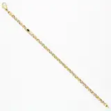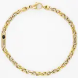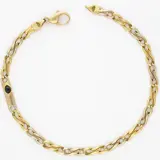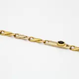 18 karaat geelgouden fantasieschakel armband bezet met een ovale cabochon geslepen saffier van ca. 0.27 ct. De saffier is gezet in een open kastzetting.