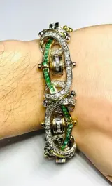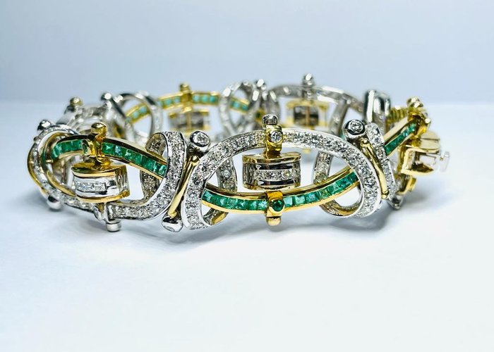 Fantastische armband van de hoogste sieraden, een uniek stuk subliem vakmanschap volledig in 18kt tweekleurig goud, met ronde briljant en carrè geslepen diamanten voor een totaal gewicht van 12,72 ct geschat hoge kwaliteit G kleur VS geschat en 86 carrè en rond geslepen smaragden natuurlijk alpha kwaliteit met een geschat totaal gewicht van naar schatting 7.35ct