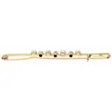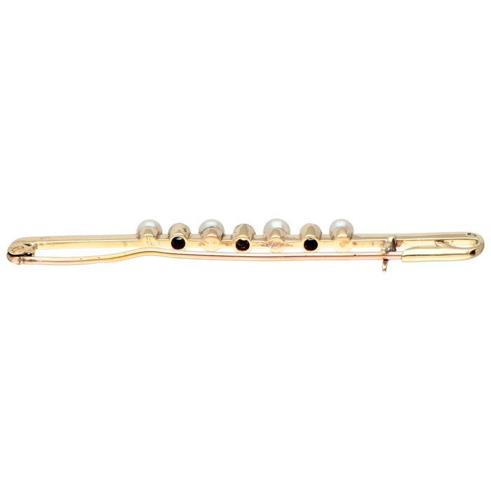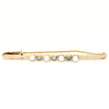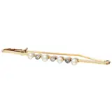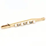 Geelgouden staaf broche bezet met 3 briljant geslepen diamanten van totaal ca. 0.09 ct. en 4 witte parels. De diamanten zijn gezet in een open kastzetting.
