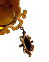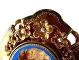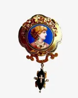 Oostenrijkse broche uit het einde van de 19e eeuw met een handgeschilderd geëmailleerd portret van een vrouw. Fijn gebeiteld. In de loop van de tijd is er een hanger van onyxsteen ingelegd met een gouden kruis en kleine kraaltjes aan toegevoegd.