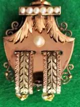 Schitterende en indrukwekkende Elizabethaanse broche/hanger/camee in tweekleurig 18-karaats goud.