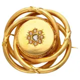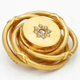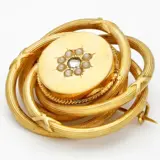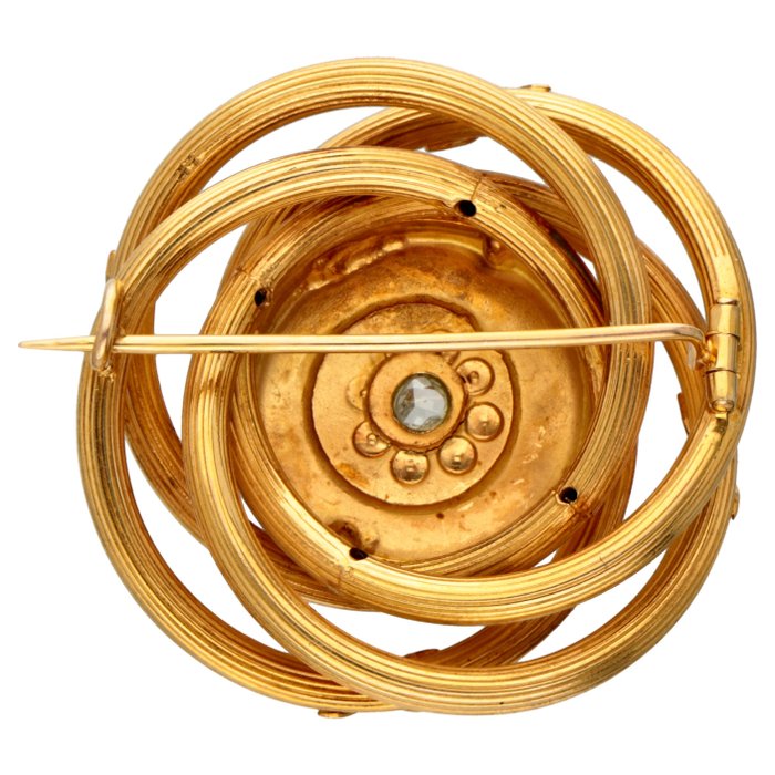 Geelgouden broche bezet met een roos geslepen diamant en 8 zaadparels. De diamant is gezet in een open zetting. De broche is voorzien van een getorste bewerking.