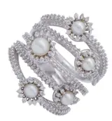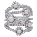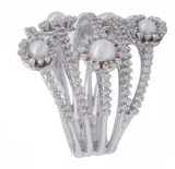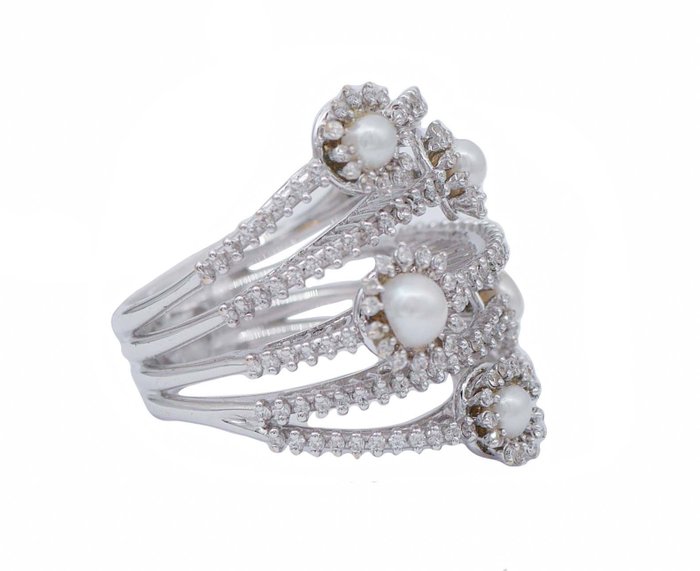 Ring in 18 kt witgoud bezet met rijen diamanten met een kleine parel.