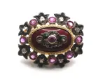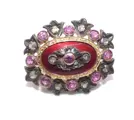 Zwaar Victoriaans 18k geel goud + sterling zilveren diamant + robijn + emaille broche. Deze modieuze Victoriaanse broche is gemaakt van massief 18k geel goud en sterling zilver en heeft ongeveer 0,50 karaat diamanten met SI1 - I1 helderheid en H 0 J kleur en ongeveer 0,78 karaat robijnen. De broche heeft een Victoriaans ontwerp met robijnen en diamanten gezet in sterling zilver. Het midden van de broche is geplaatst boven rood email. Met een rechte speld en stevige sluiting, een prachtige antieke broche met veel stijl