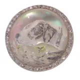 Techniek: English crystal of a reverse crystal intaglio is een cabochon van bergkristal met een intaglio uitgehouwen in de platte achterkant. De diepdruk wordt vervolgens realistisch beschilderd met olieverf, zodat de afbeelding van bovenaf gezien een driedimensionaal effect heeft. Ten slotte werd de achterkant verzegeld met parelmoer waardoor de geverfde delen behouden bleven. De techniek is ontstaan in België c. 1860 en werd gepopulariseerd in Engeland c. 1860 door Thomas Cook.