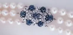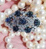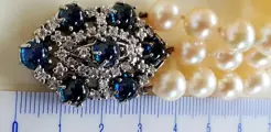 38 mm x 24 mm x 10 mm in 18 kt witgoud met 7 natuurlijke cabochonsaffieren van 7 mm x 6 mm, +/- 16-18 ct +/- en 34 briljant geslepen diamanten van 3 mm +/-, 2 ct +/- WWS1/WWS2/VS1 G/H kleur .