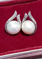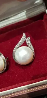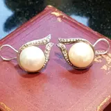 Schitterende oorhangers in 18K witgoud met 2 "mabe" parels van 17mm +/- licht creme witte kleur en 26 briljant geslepen diamanten 13 per oorbel van 1.2-2.0 mm +/-.