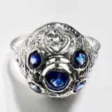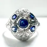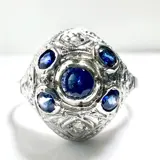 Ring van 750/18 kt witgoud. De ringkop heeft de vorm van een koepel en de fijne opengewerkte versiering volgt de Art Deco-stijl. 4 helderblauwe saffieren totaal 0,30 ct. contrasteren met het witte goud. Alle vier de hoeken zijn elk bezet met een roosgeslepen diamant. Samen hebben de diamanten rozen ca. 0,06 ct.