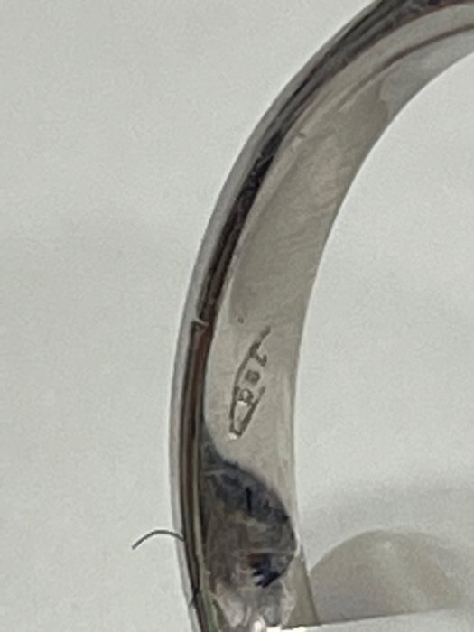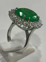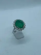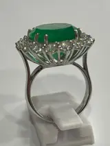 Ring volledig met de hand gemaakt door een meester goudsmid in 18 kt witgoud voor een gewicht van 5,90 gram. In het midden is een natuurlijke beryl van de smaragdgroene variëteit van composiet ovaal geslepen uit Colombia voor een gewicht van 12,57 ct met F3-behandeling. Rond de rand zijn 16 ronde briljante diamanten gerangschikt voor een totaal gewicht van ct. 3,85 H-kleur en VS-helderheid. Het totale gewicht van de ring is 9,75 gram.