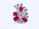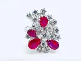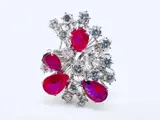 Ring van 18kt witgoud met natuurlijke robijnen en natuurlijke diamanten gemaakt in Italië met het keurmerk 750. De ring heeft 4 gefacetteerde peergeslepen robijnen, waarvan er twee elk 0,75 wegen en twee elk 0,42 wegen voor een totaal van 2,35 karaat in kleur. Natuurlijk onbehandeld transparant paarsachtig- rood. De ring heeft ook 16 diamanten van elk 0,10 karaat voor een totaal van 1,65 karaat rond briljant geslepen G/H kleur VS/SI zuiverheid natuurlijk onbehandeld. Maat 19/59 op aanvraag is het mogelijk om het aan te passen. Totaal gewicht 8,40 gram.