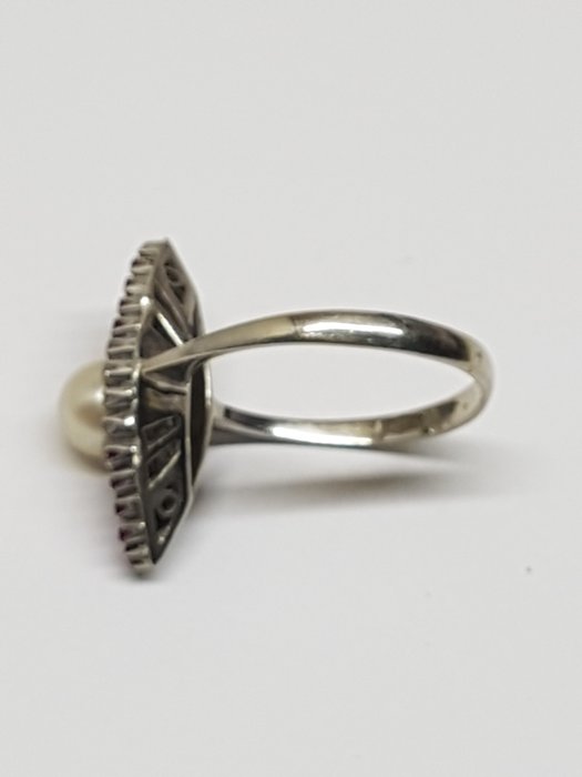 Antieke ring in 18 kt witgoud, gewicht 5 gram, Italiaanse maat 18, een gekweekte parel in het midden, diameter 7 mm rond 1,5 ct, 32 witte en rode robijnen.Verzonden met etui en aangetekende post met tracking.