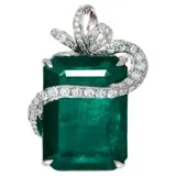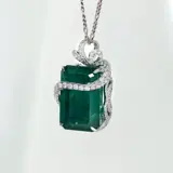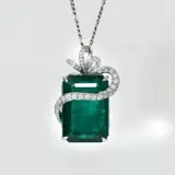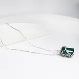 Het diepe groen met de glans van natuurlijke smaragd omringd met diamanten op het zeer fijne ontwerp maakt het collier zeer luxueus en opvallend.