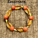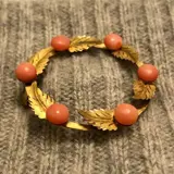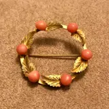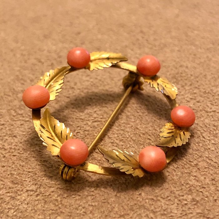 Gestileerde broche in de vorm van een guirlande met zalmroze koraal en burijn gegraveerde bladeren. Op de cirkel 6 5 mm cabochon koralen gerangschikt, afgewisseld met 6 blaadjes.