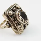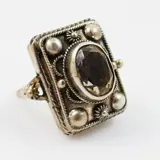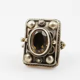 Een vintage ring met een geheim doosje, verborgen achter een zetting met een ovaal gefacetteerde rookkwarts. In de band is aan de achterzijde te zien dat de maat in het verleden gewijzigd is.