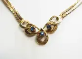 Het middelste deel is gemaakt als een tweedradige gesatineerde band, die een decoratief deel heeft van gestructureerde tranen met in het midden ronde gefacetteerde blauwe saffieren. Deze twee strengen versmelten tot een enkele strengband richting de nek. Er is nog een traan met saffieren versieringen aan beide zijden. Het collier is bezet met in totaal 5 blauwe saffieren.