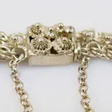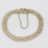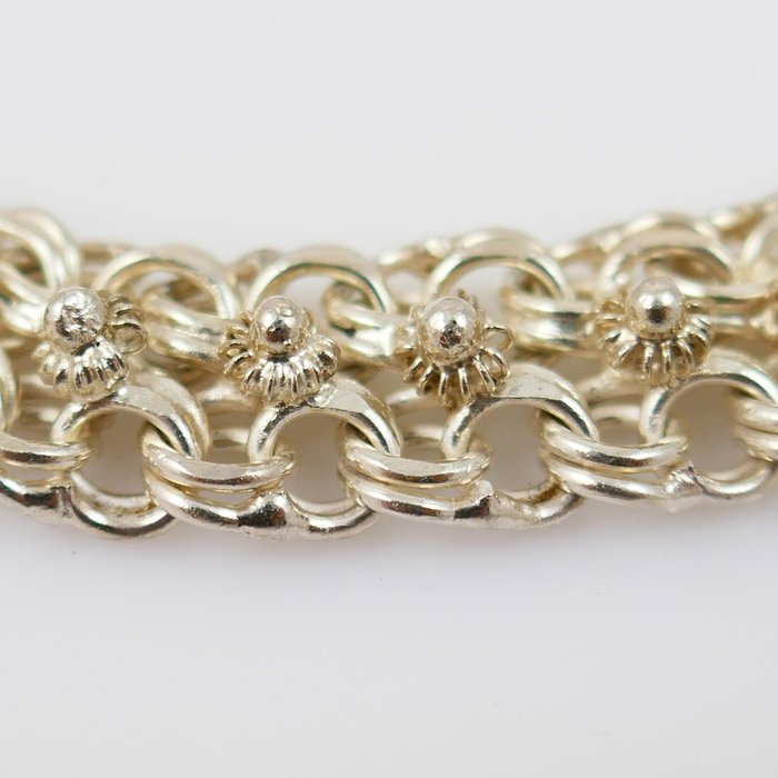 Een vintage zilveren armband met vele kleine zilveren knoopjes. Ook de sluiting is versierd. De armband is verkocht door juwelier van Leeuwen in Wassenaar (1953-). De armband is voorzien van een veiligheidsketting.
