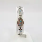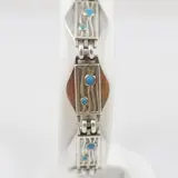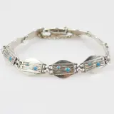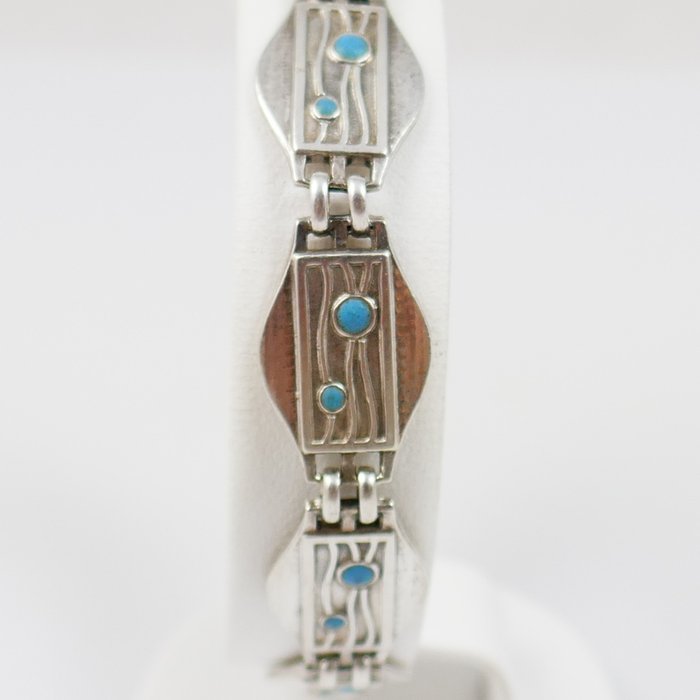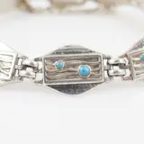 Een vintage zilveren armband met 6-hoekige schakels die gedecoreerd zijn met golvende lijnen in een rechthoek en kleine turkoois cabochons.